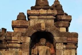 Borobudurโs hidden Kamadhatu level consists of 160 reliefs depicting scenes of Karmawibhangga Sutra, the law of cause and effect. Illustrating the human behavior of desire, the reliefs depict robbing, killing, rape, torture and defamation. A corner of the covering base has been permanently removed to allow visitors to see the hidden foot, and some of the reliefs. ย Photography of the entire collection of 160 reliefs is displayed at theย Borobudur Museumย which is within the Borobudur Archaeological Park.